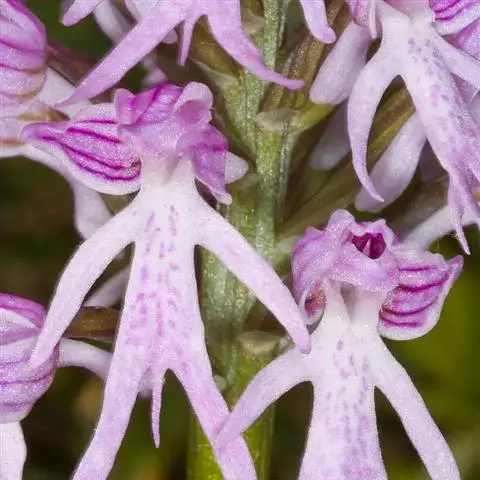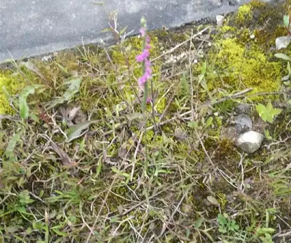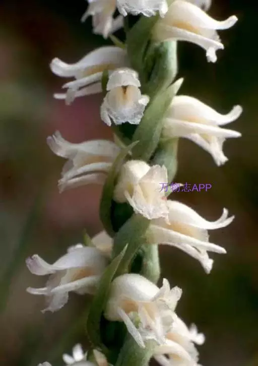 花茎直立,长10-25厘米,上部被腺状柔毛至无毛;总状花序具多数密生的花,长4-10厘米,呈螺旋状扭转;花苞片卵状披针形,先端长渐尖,下部的长于子房;子房纺锤形,扭转,被腺状柔毛,连花梗长4-5毫米;花小,紫红色、粉红色或白色,在花序轴上呈螺旋状排生;萼片的下部靠合,中萼片狭长圆形,舟状,长4毫米,宽1.5毫米,先端稍尖,与花瓣靠合呈兜状;侧萼片偏斜,披针形,长5毫米,宽约2毫米,先端稍尖。