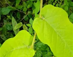 叶大,卵形至长圆状卵形,长8-18厘米或更长,宽5-11厘米或更宽,先端钝,基部不相等,边缘浅波状或深波状圆裂,上面被3-7-(8)分枝短而平贴的星状绒毛,下面密被7-8分枝较长而平贴的星状绒毛,侧脉每边4-5条,在上面疏被星状绒毛,在下面则较密,中脉的毛被与侧脉的相同(野生种的中脉及侧脉在两面均具小皮刺),叶柄长约2-4.5厘米(野生的具皮刺)。