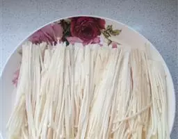 ⑴预煮把5%~10%食盐水置于铝锅内煮沸,倒入金针菇,煮沸5~7分钟,捞出沥去水分。