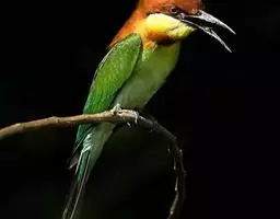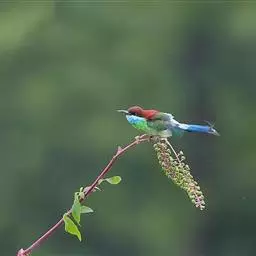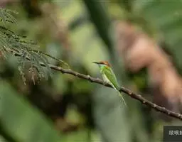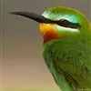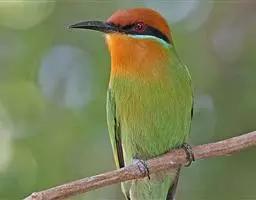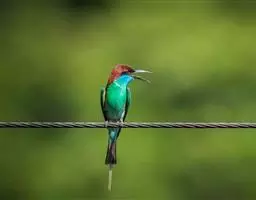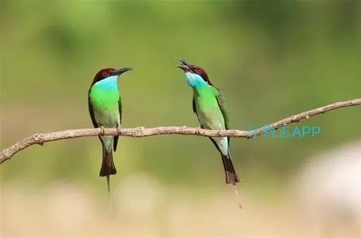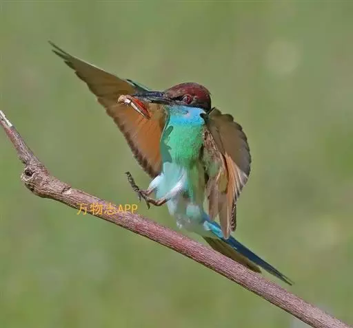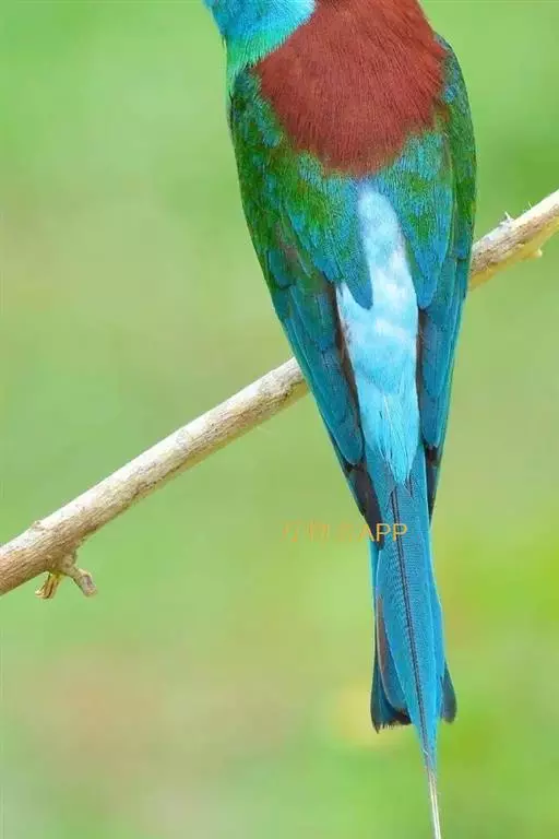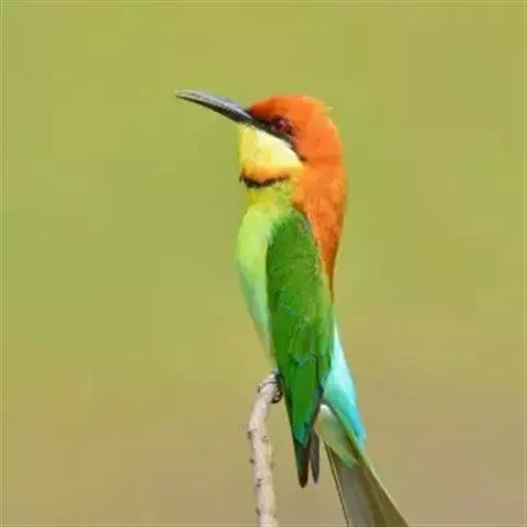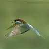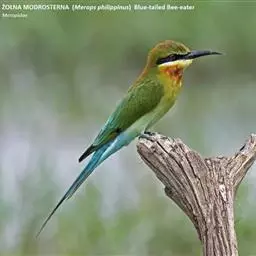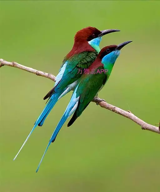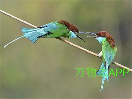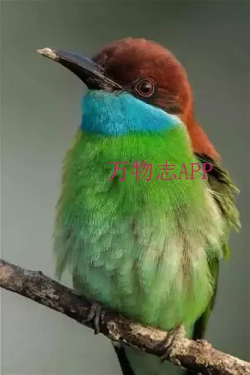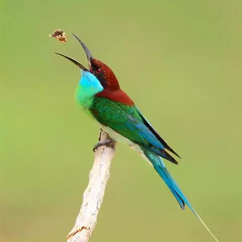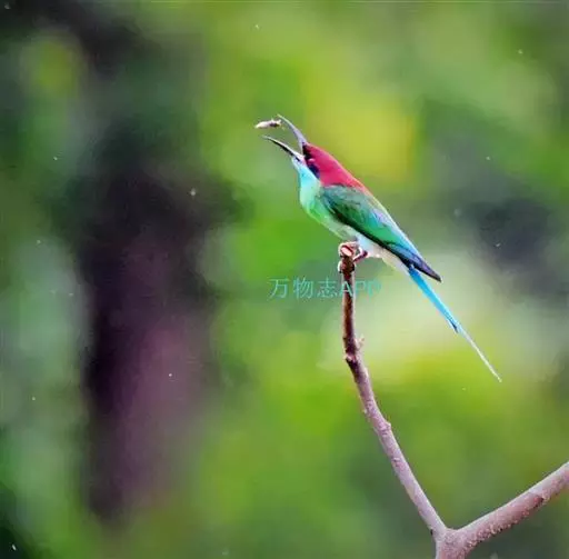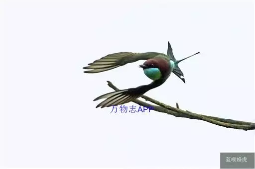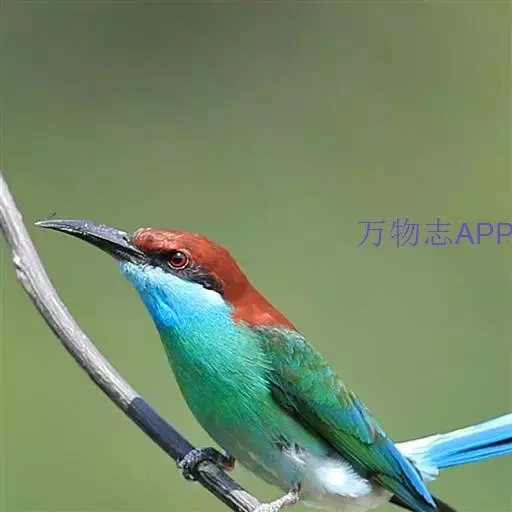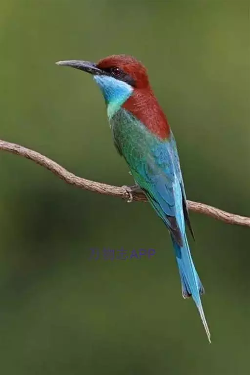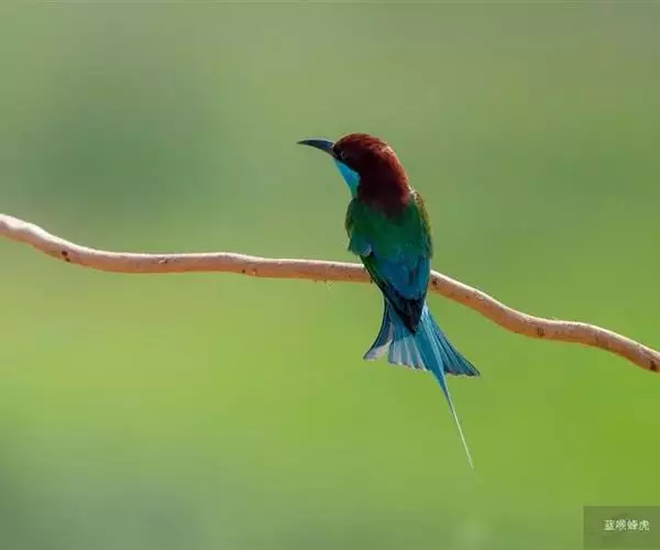 蓝喉蜂虎(学名:Merops viridis)中型鸟类,体长26~28厘米。头顶至上背栗红色或巧克力色,过眼线黑色,腰和尾蓝色,翼蓝绿色,腰及长尾浅蓝,中央尾羽延长成针状,明显突出于外。颏喉蓝色,其余下体和两翅绿色。嘴细长而尖,黑色,微向下曲。