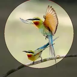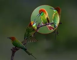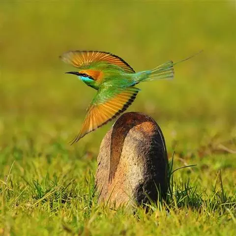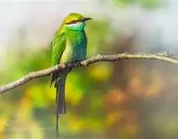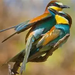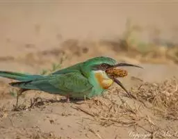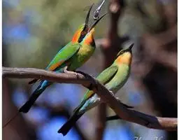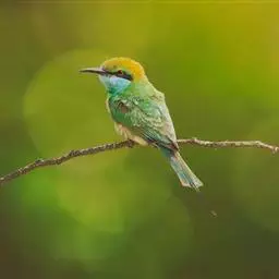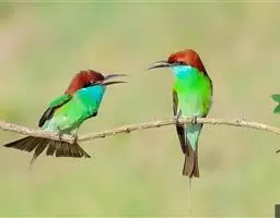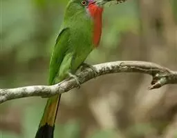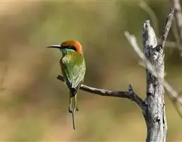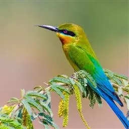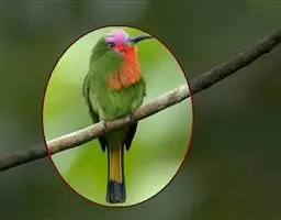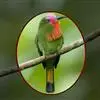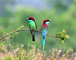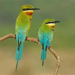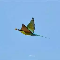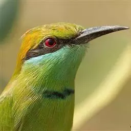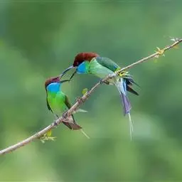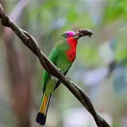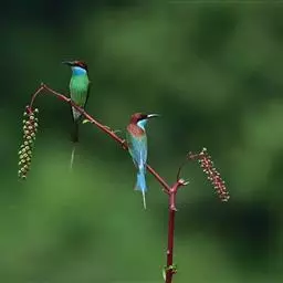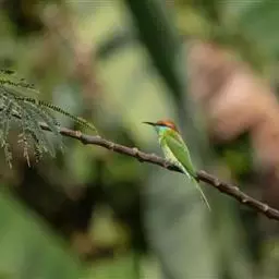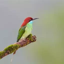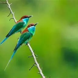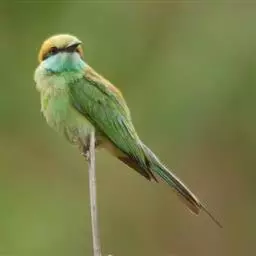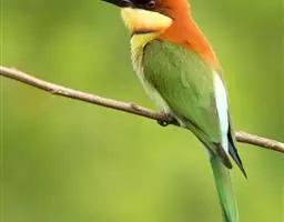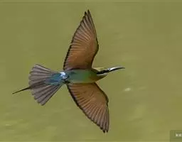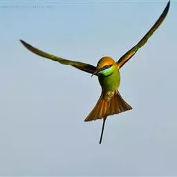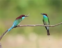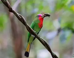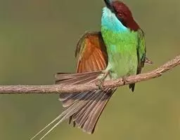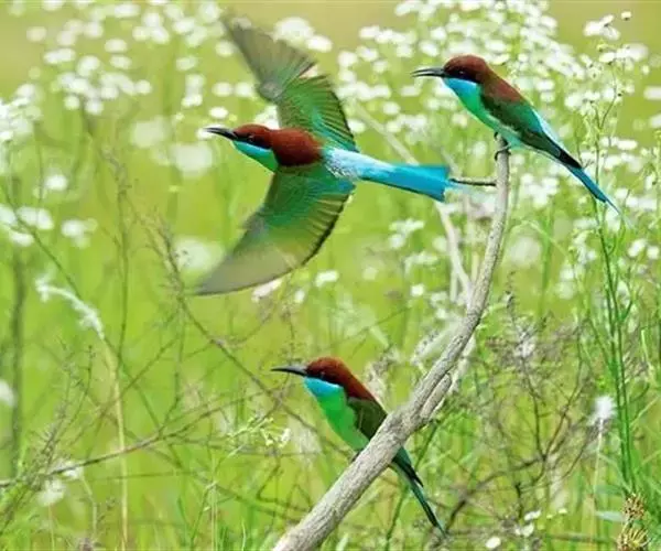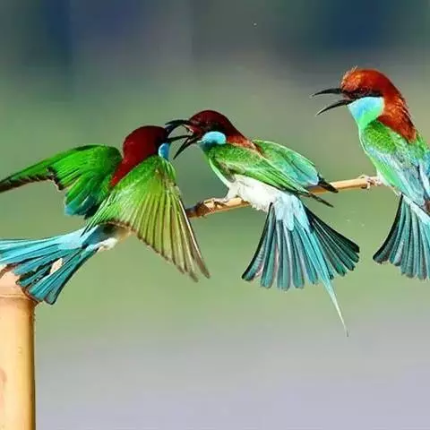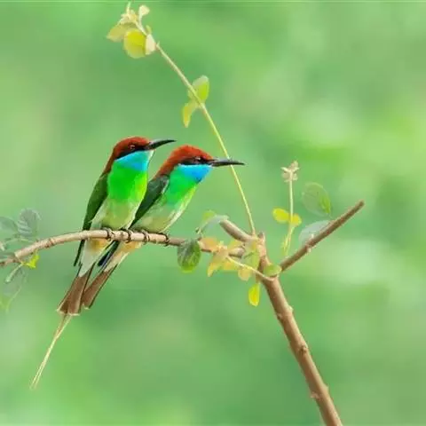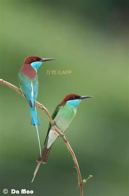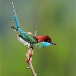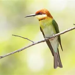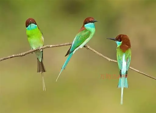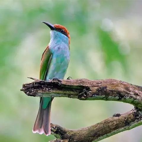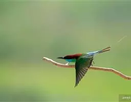 蓝喉蜂虎(学名:Merops viridis)中型鸟类,体长26~28厘米。头顶至上背栗红色或巧克力色,过眼线黑色,腰和尾蓝色,翼蓝绿色,腰及长尾浅蓝,中央尾羽延长成针状,明显突出于外。颏喉蓝色,其余下体和两翅绿色。嘴细长而尖,黑色,微向下曲。