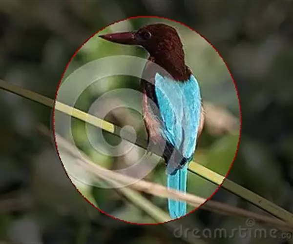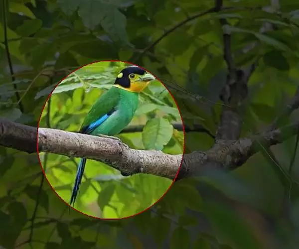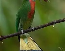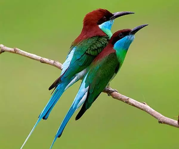前额、头顶、枕、后颈和上背深栗色,下背蓝绿色,腰天蓝色,尾蓝色,中央尾羽延长,突出约65毫米;肩和翅绿色,内侧飞羽蓝色,贯眼纹黑色,到眼后变宽。颏、喉和颈侧蓝色,胸和上腹绿色,腹淡绿色,尾下覆羽淡蓝色。