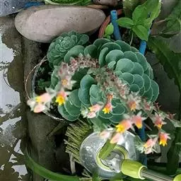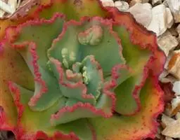 松果红爪 植株直立,株高20厘米以内,成株呈塔状或松果。叶排列呈莲座状,叶片长匙形,肉质,被白霜,具明显的短叶尖,呈暗紫红色,叶片不易晒红。紫红色的花茎抽出自叶腋,总状花序,小花钟形,花瓣5,花瓣背部橙红色,花瓣内部相对背部偏黄。可采用叶插和播种繁殖栽培,性喜光照充足、温暖、干燥的生长环境。