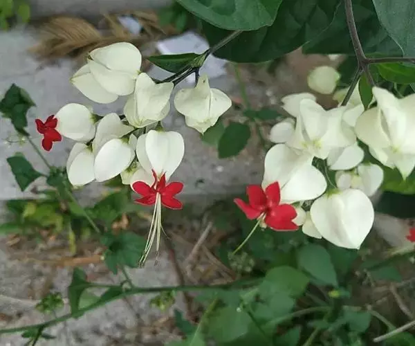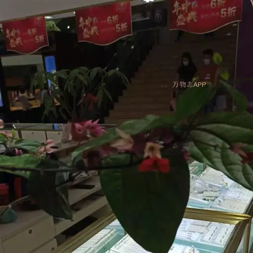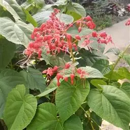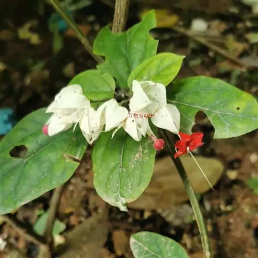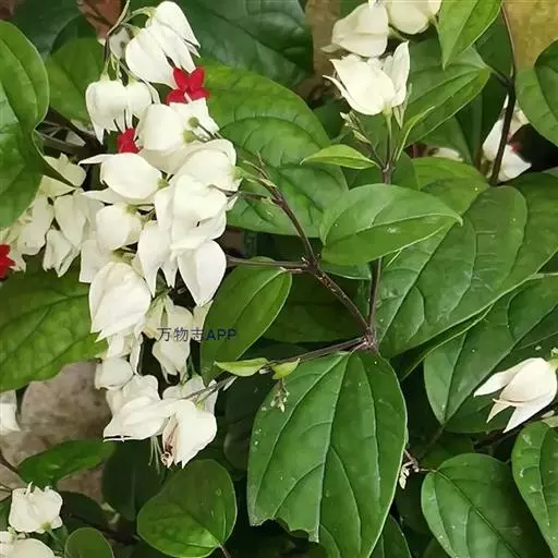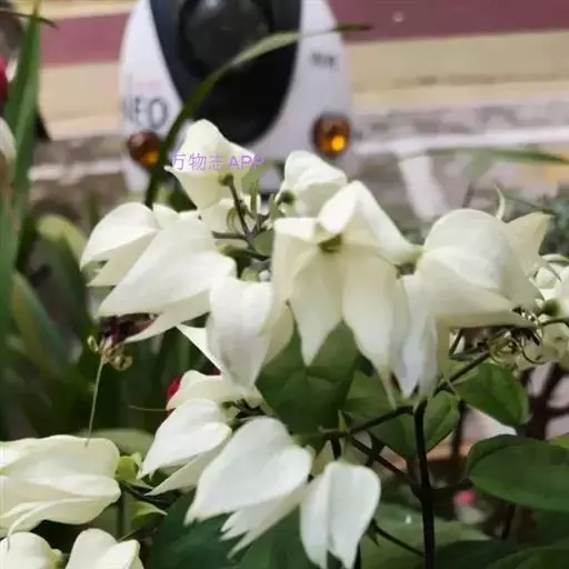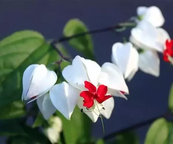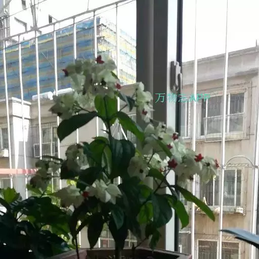 龙吐珠(学名:Clerodendrum thomsonae Balf.):马鞭草科灌木,幼枝四棱形,被黄褐色短绒毛,老时无毛。叶片纸质,狭卵形或卵状长圆形,顶端渐尖,基部近圆形,全缘;聚伞花序腋生或假顶生,二歧分枝;苞片狭披针形;花萼白色,基部合生,中部膨大,裂片三角状卵形,顶端渐尖;花冠深红色,外被细腺毛,裂片椭圆形;雄蕊4,与花柱同伸出花冠外;柱头2浅裂。核果近球形,外果皮光亮,棕黑色;宿存萼不增大,红紫色。花期3-5月。