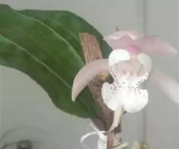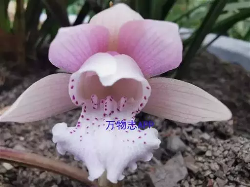 花葶长10-17厘米,紫色,具2枚鞘;鞘膜质,下部抱茎,长3-4厘米;花苞片小,凋落;花梗和子房长7-9毫米;花大,白色而带肉红色或淡紫色晕,唇瓣有紫红色斑点;萼片长圆状披针形,长2.7-3.3厘米,宽7-9毫米,先端钝,有5-7脉;侧萼片稍斜歪。