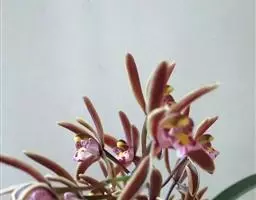 红花隔距兰(学名:Cleisostoma williamsonii (Rchb. f.) Garay):植株通常悬垂。茎细圆柱形,长达70厘米,粗3-4毫米,分枝或不分枝,具多数互生的叶,节间长1-2.5厘米。叶肉质,圆柱形,伸直或稍弧曲。花序侧生,斜出,比叶长,通常分枝;花粉红色,开放;花瓣长圆形,长2.2毫米,宽1毫米,先端钝,具1条脉;唇瓣深紫红色,3裂。花期4-6月。