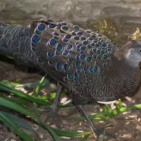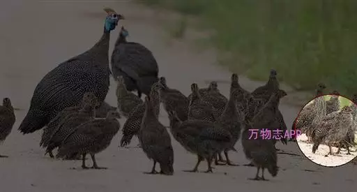 珠鸡又叫珍珠鸡、普通珠鸡。体长72—220厘米,体重1590—2725克。雄鸟头顶和羽冠黑色。裸露的脸部为蓝灰色。体羽主要为暗褐色,有皮黄色和暗褐红色的斑纹。翅膀和尾羽上有白斑和呈灰绿色、紫色和皮黄色虹彩的眼状斑,在内侧飞羽上排成一列,外圈为黑色及淡皮黄色。雌鸟头顶为黑色并有棕褐色和皮黄色羽缘,冠羽为暗灰色。裸露的脸部为蓝灰色。后头为栗褐红色。体羽有黑色杂斑和条纹,以及褐红色、栗色和皮黄色的虫蠹状斑纹。虹膜褐色;嘴浅蓝色或白色;腿、脚近红色。