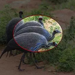 珠鸡(Guinea fowl)是鸡形目珠鸡科的鸟类, 分为4属6种,是一种身体肥胖、头小的中型陆生鸟类,高40~72cm,头部和颈部皮肤裸露,多数种类有冠或骨质盔。珠鸡科鸟类分布于非洲的热带地区,栖息地范围广泛,从茂密的雨林到半荒漠都有分布。珠鸡用爪挖食昆虫、种子和块茎。翅短而圆,善飞行,但遇到威胁时多奔跑逃走。春季产12枚卵於地面凹陷处。