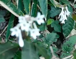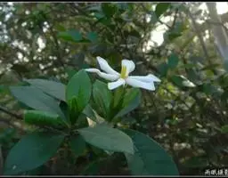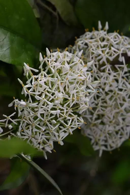花: 3歧伞房聚伞花序长达7厘米,花序梗长约4厘米。花芳香,花梗长1-2毫米;有苞片和小苞片;萼筒长约1.5毫米,花萼裂片与萼筒等长或略短;花冠白色,冠筒长2.5-3.5厘米,花冠裂片长圆形,长6-7毫米,花药伸出。