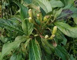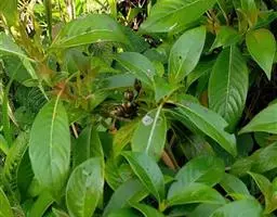叶纸质,长圆形,长5-14厘米,宽2-5厘米,先端钝圆,基部楔形或稍圆,侧脉8-10对,近叶缘连成边脉;叶柄长3-6毫米,托叶卵形,长0.4-1厘米,先端长渐尖,渐尖部分长3-4毫米。3歧伞房聚伞花序长达7厘米,花序梗长约4厘米。