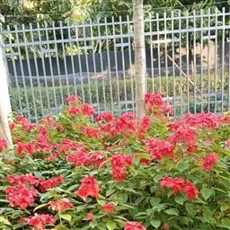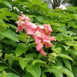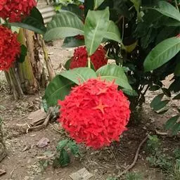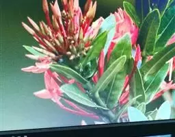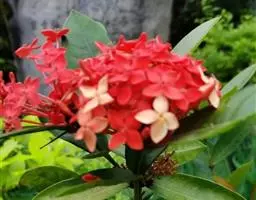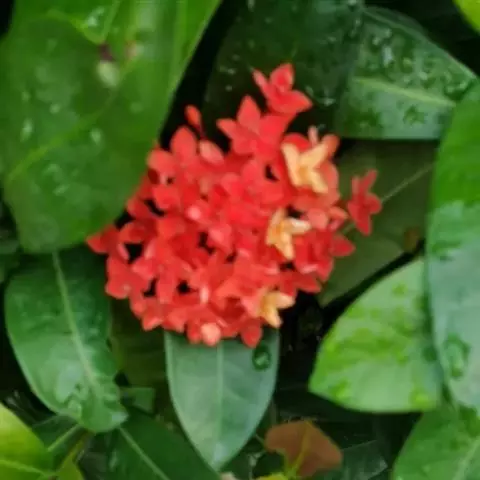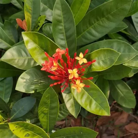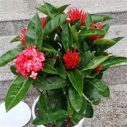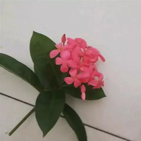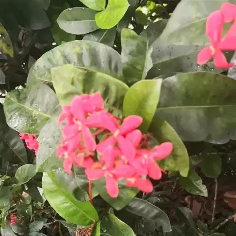 海南龙船花 叶: 叶纸质,长圆形,长5-14厘米,宽2-5厘米,先端钝圆,基部楔形或稍圆,侧脉8-10对,近叶缘连成边脉;叶柄长3-6毫米,托叶卵形,长0.4-1厘米,先端长渐尖,渐尖部分长3-4毫米。