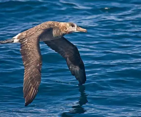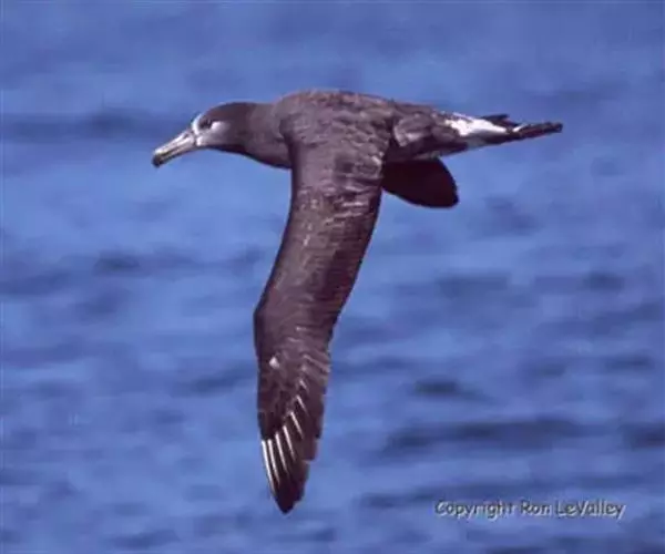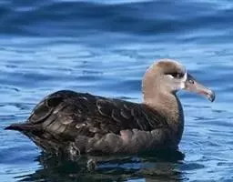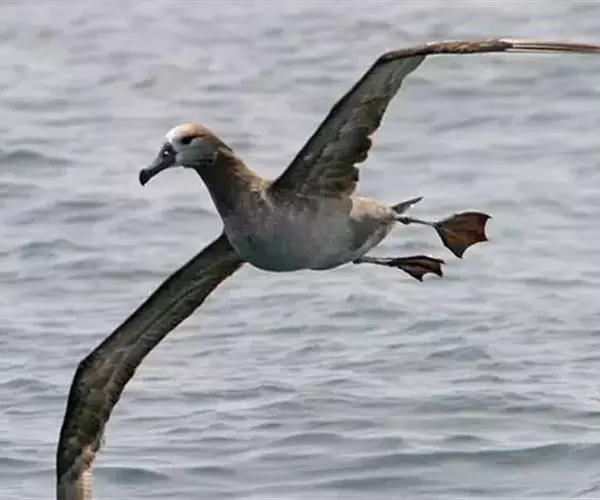 黑脚信天翁上体黑褐色,部分尾上覆羽白色,下体灰色,往腹中部逐渐变淡。尾下覆羽亦有部分为白色。嘴基周围白色,前额灰色,眼下和经过眼区有白色横斑。颊前部和颏白色,颊后部、喉和耳区灰色,前颈灰褐色。飞羽、翅覆羽和尾羽黑褐色,略较上体为暗。体羽厚而密,紧覆于身上。翅尖长。初级飞羽11枚,第一枚退化,第二枚最长,第十一枚最短。次级飞羽37枚,非常短。肩羽非常长,尾短而稍圆,尾羽12枚。嘴强而侧扁、长度中等,几和头等长。脚强而短,跗蹠左右侧扁,具网状鳞,后趾匿藏于皮下。