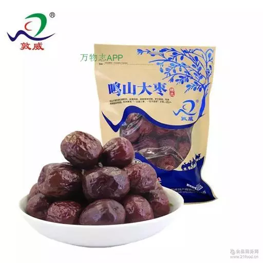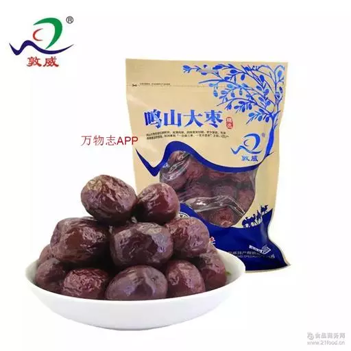 据史料记载,红枣是原产中国的传统名优特产树种。经考古学家从新郑裴李岗文化遗址中发现枣核化石,证明枣在中国已有8000多年历史。早在西周时期人们就开始利用红枣发酵酿造红枣酒,作为上乘贡品,宴请宾朋。红枣的营养保健作用,在远古时期就被人们发现并利用。《诗经》已有“八月剥枣”的记载。《礼记》上有“枣栗饴蜜以甘之”,并用于菜肴制作。《战国策》有“北有枣栗之利……足食于民”,指出枣在中国北方的重要作用。《韩非子》还记载了秦国饥荒时用枣栗救民的事。所以民间一直视枣为“铁杆庄稼”“木本粮食”之一。枣作为药用也很早,《神农本草经》即已收载,历代药籍均有记载,对其养生疗病的认识不断深化。