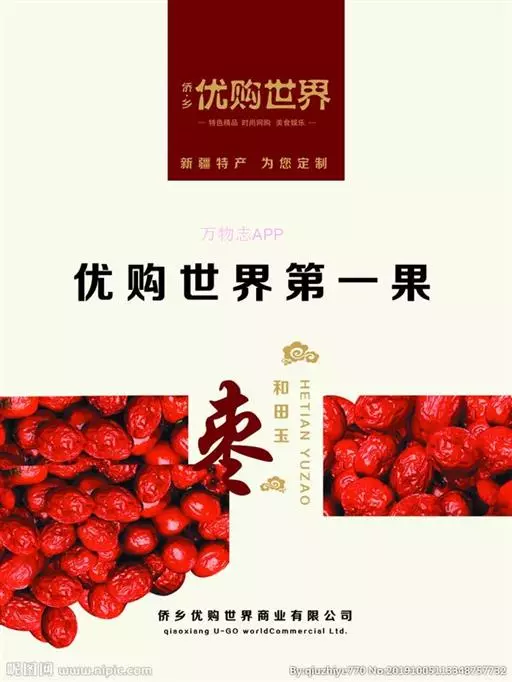 新疆和田地区的和田红枣。和田红枣的营养和保健价值极高。它含蛋白质、脂肪、糖类、纤维素;红枣营养十分丰富。维生素C含量在水果中名列前 茅,每百克含量达0.1~0.6克,比苹果、桃子等高100倍左右,维生素P的含量也是百果之冠,人们称赞枣是“天然的维生素丸”。人们历来就把红枣视为极佳的滋补品。红枣不但是美味果品,还是滋补良药,有强筋壮骨、补血行气、滋颐润颜之功效。