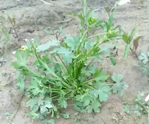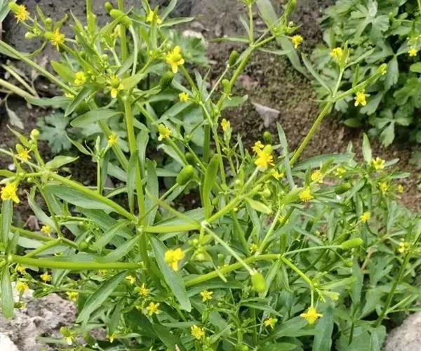 石龙芮 一年生草本。须根簇生。茎直立,高10-50厘米,直径2-5毫米,有时粗达1厘米,上部多分枝,具多数节,下部节上有时生根,无毛或疏生柔毛。