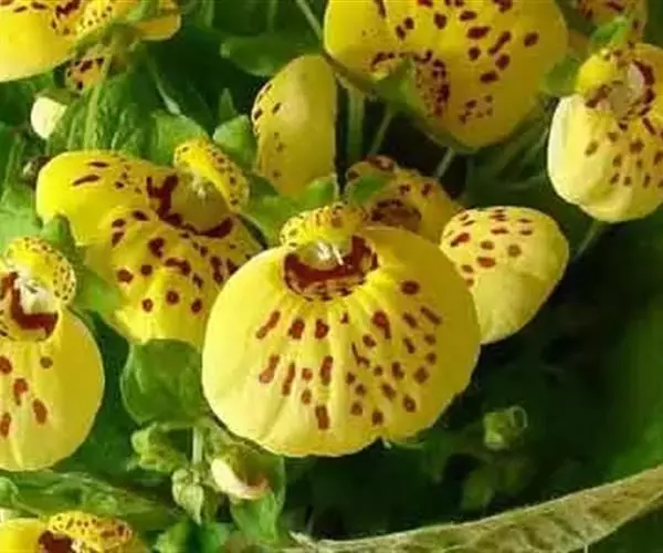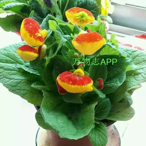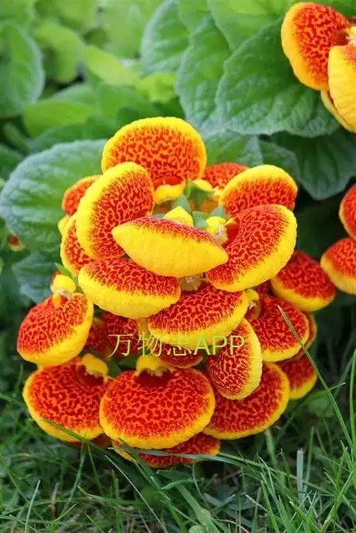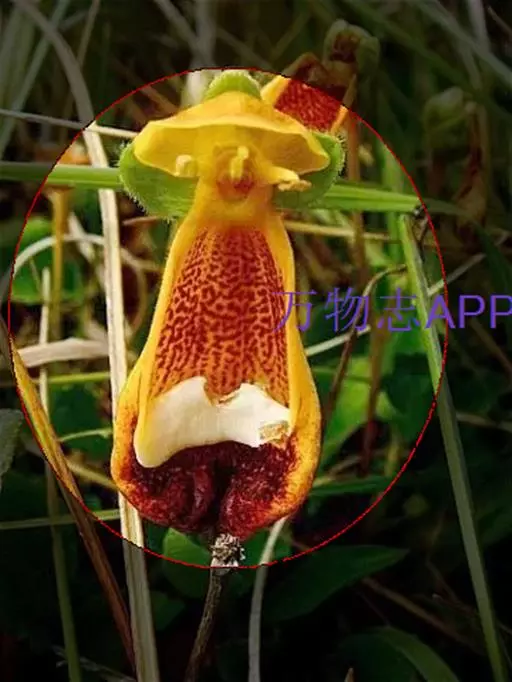 叶片卵形对生。花形别致,花冠二唇状,上唇瓣直立较小,下唇瓣膨大似蒲包状,中间形成空室,柱头着生在两个囊状物之间。