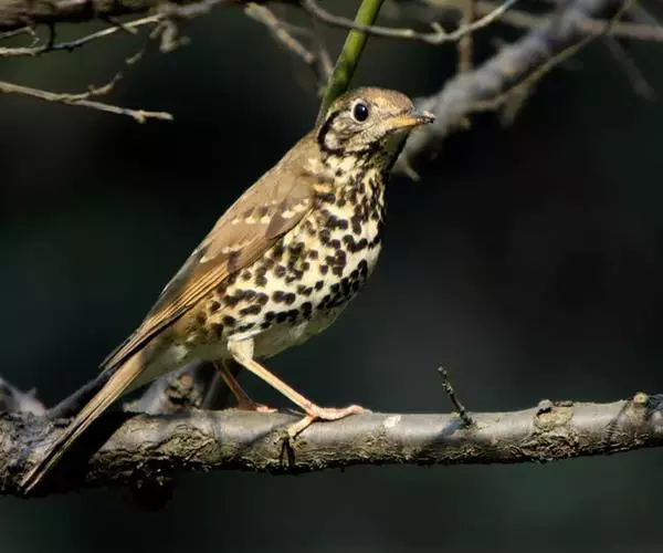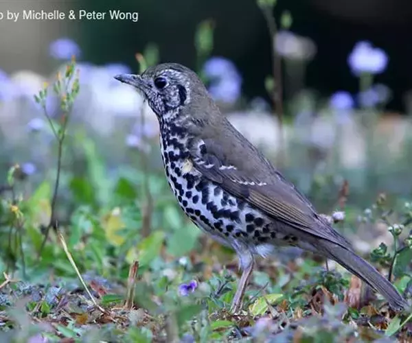 宝兴歌鸫为中型鸟类,体长20-24cm。上体橄榄褐色,眉纹棕白色,耳羽淡皮黄色具黑色端斑,在耳区形成显著的黑色块斑。下体白色,密布圆形黑色斑点。