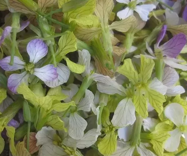 总状花序,萼片椭圆状披针形,长5-10毫米;花瓣白色、淡红色、黄色或紫堇色,宽倒卵形,顶端平截,基部具长爪。长角果长20-60毫米,宽3-5毫米;种子间缢缩,顶端具一细长的喙;果瓣坚实,节节断裂。种子卵形或近球形,直径1.5-2.5毫米 。