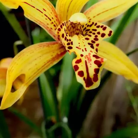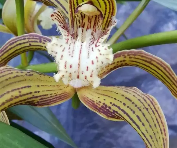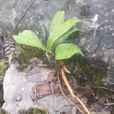 虎头兰是附生草本植物;假鳞茎狭椭圆形至狭卵形,长3-8厘米,宽1.5-3厘米,大部分包藏于叶基之内。叶4-6 (-8)枚,长35-60(-80)厘米,宽1.4-2. 3厘米,带形,先端急尖,关节位于距基部(4-)6-10厘米处。
