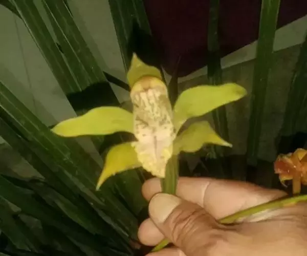 花葶从假鳞茎下部穿鞘而出,外弯或近直立,长45-60(-70)厘米;总状花序具7-14朵花;花苞片卵状三角形,长3-4毫米;花梗和子房长3-5厘米;花大,直径达11-12厘米,有香气;萼片与花瓣苹果绿或黄绿色,基部有少数深红色斑点或偶有淡红褐色晕,唇瓣白色至奶油黄色,侧裂片与中裂片上有栗色斑点与斑纹,在授粉后整个唇瓣变为紫红色;萼片近长圆形,长5-5.5厘米,宽1.5-1.7厘米。