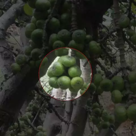 榕果成对腋生或生于已 落叶枝上,球形或椭圆球形,无梗或近无梗,直径10-15毫米,幼时顶部苞片形成脐状 凸起,基生苞片卵状披针形,长10-30毫米,膜质,红色,被柔毛;雌花果球形,雄花 及瘿花果卵球形,无柄或近无柄,直径10-15毫米,幼嫩时顶部苞片形成脐状凸起,基生苞片早落,卵状披针形,先端急尖,外面被贴伏柔毛;雄花生于榕果内壁近口部,有 柄,花被片4,披针形,红色,雄蕊2-3枚,花药椭圆形,长于花丝;瘿花花被片与雌 花同数,子房球形,光滑,花柱侧生,短,柱头漏斗形;雌花生雌株榕果内,有梗或无 梗,花被片4。瘦果椭圆球形,表面光滑,花柱贴生于一侧微凹处,细长,柱头棒状。