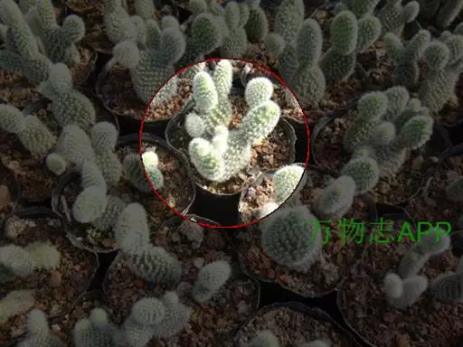 仙人掌科植物,呈灌木状丛生。为黄毛掌的变种。植株比黄毛掌矮小,刺座较稀,钩毛白色,花蕾红色,开后为黄白色。 株高0.5~2米。茎直立,基部稍木质化,呈圆柱形,其余呈掌状,扁平,每一节间倒卵形至椭圆形,绿色。花单生于刺窝上,鲜黄色。浆果梨形,无刺,紫红色 。