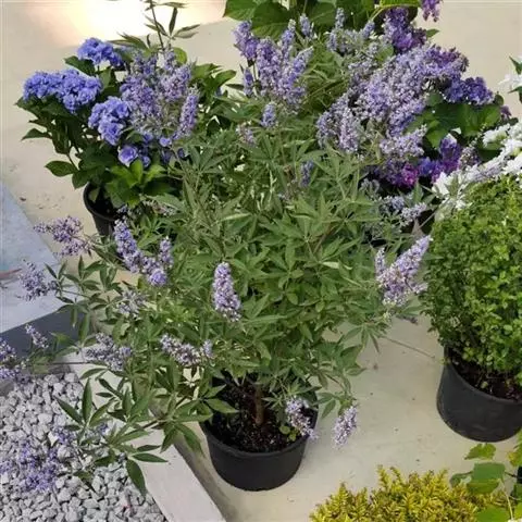 圆锥花序顶生,长3-15厘米,花序梗密被灰白色绒毛;花萼钟形,顶端5浅裂,外面有绒毛;花冠淡紫色或蓝紫色,长6-10毫米,外面及喉部有毛,花冠管内有较密的长柔毛,顶端5裂,二唇形,下唇中间裂片较大;雄蕊4,伸出花冠外;子房无毛,密生腺点;花柱无毛,柱头2裂。核果近圆形,径约5毫米,成熟时黑色;果萼宿存,外被灰白色绒毛。花期7-8月,果期8-10月。