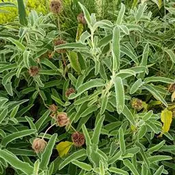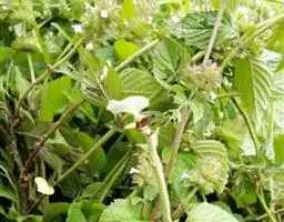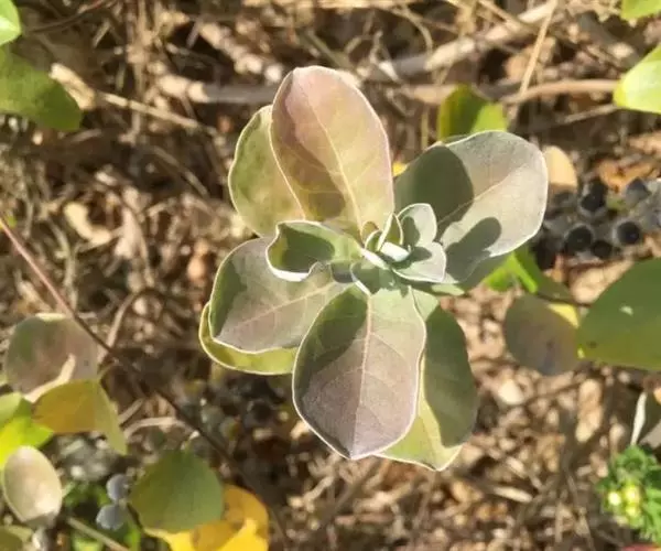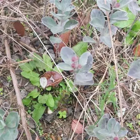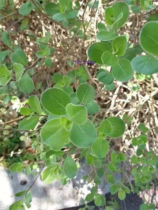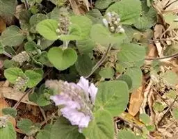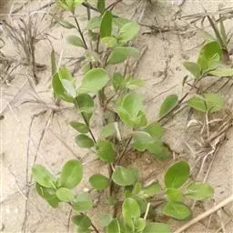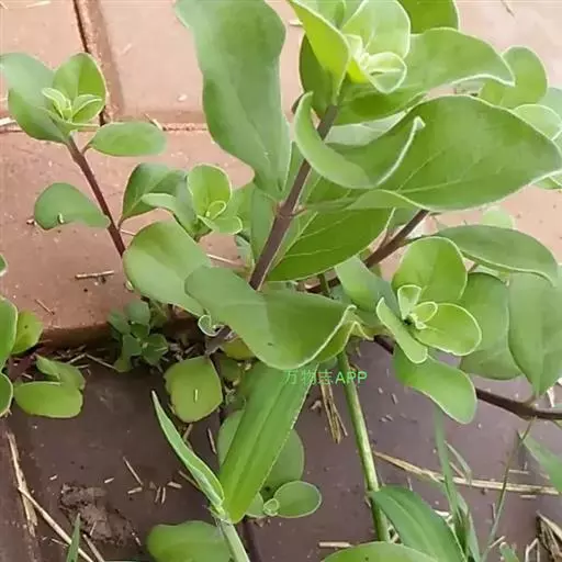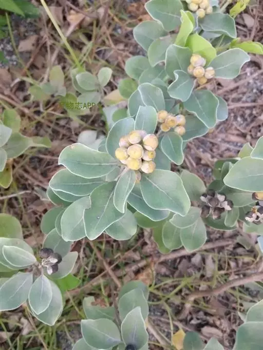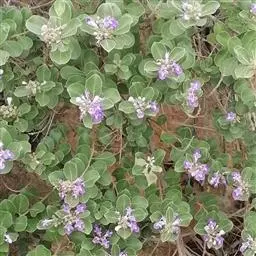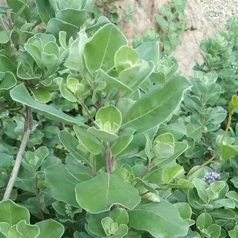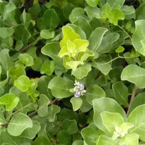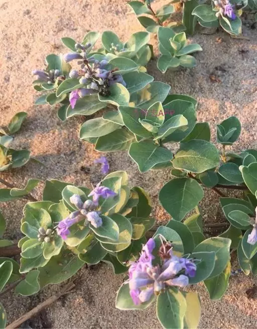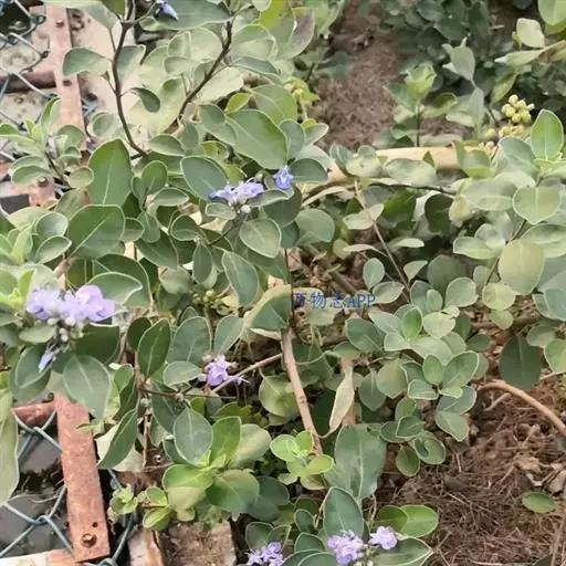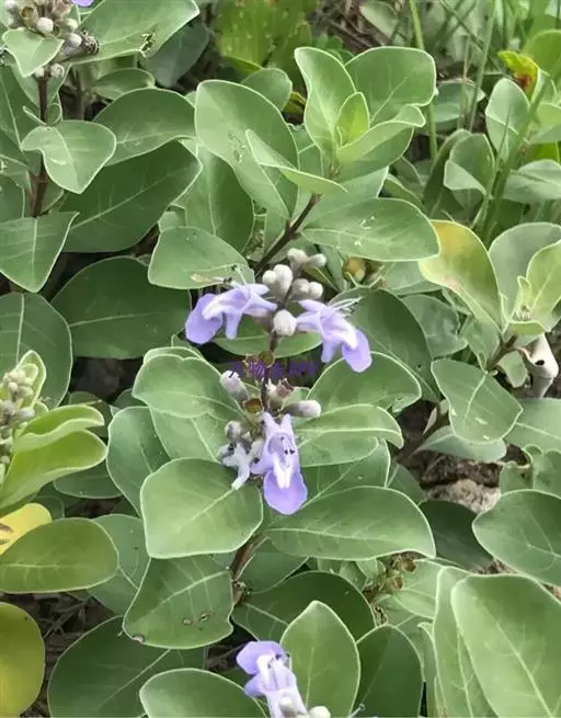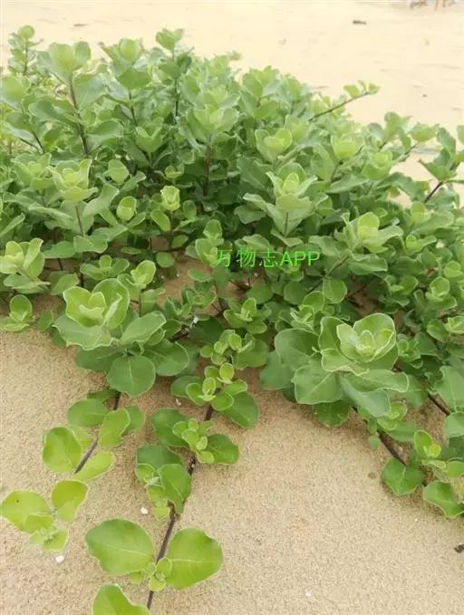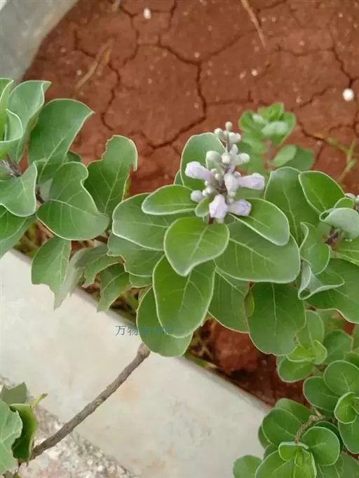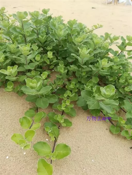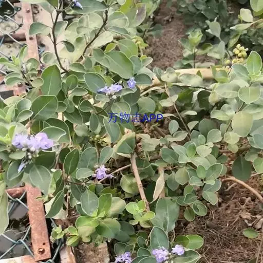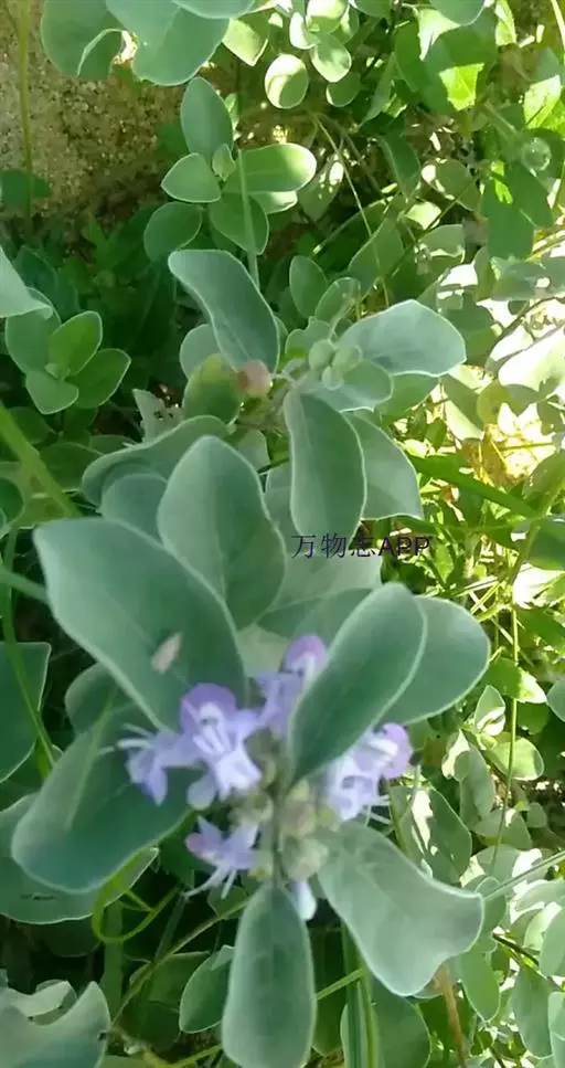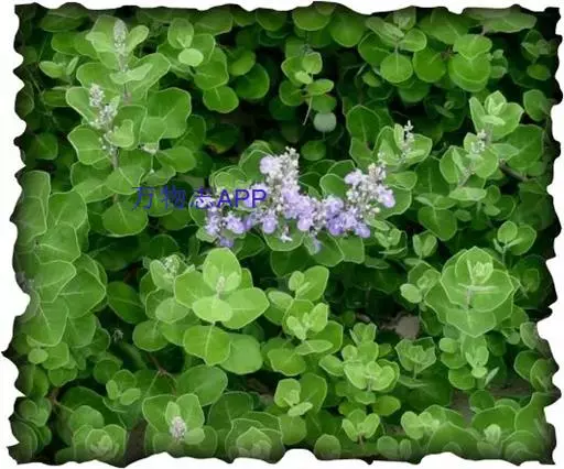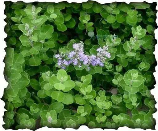 单叶蔓荆 落叶灌木,罕为小乔木,高1.5-5米,有香味;小枝四棱形,密生细柔毛。茎匍匐,节处常生不定根。单叶对生,叶片倒卵形或近圆形,顶端通常钝圆或有短尖头,基部楔形,全缘,长2.5-5厘米,宽1.5-3厘米。表面绿色,无毛或被微柔毛,背面密被灰白色绒毛,侧脉约8对,两面稍隆起,小叶无柄或有时中间小叶基部下延成短柄。