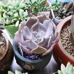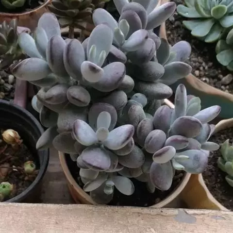 福娘为景天科银波锦属的肉质草本植物。对生的叶片呈短棒状,叶色灰绿,表覆白粉,叶缘外围镶着紫红色,…