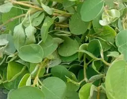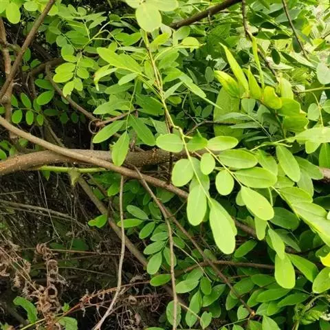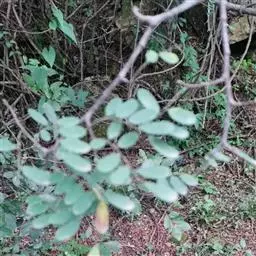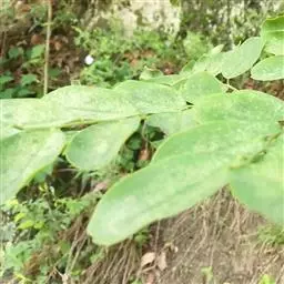 藤本,有时为灌木。枝长,干时黑色。羽状复叶长12-17厘米;叶轴、叶柄均略被犬贴微柔毛;小叶2-3对,近革质,卵形或椭圆形,长3.5-6厘米,宽1.5-3厘米,先端钝,微缺,基部楔形,上面无毛,下面干时粉白色,略被伏贴微柔毛。