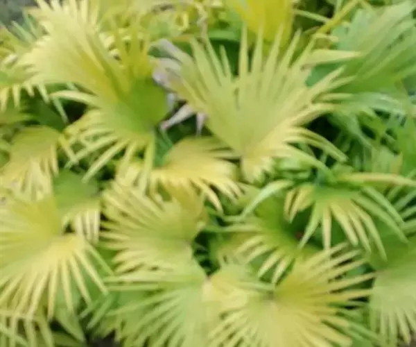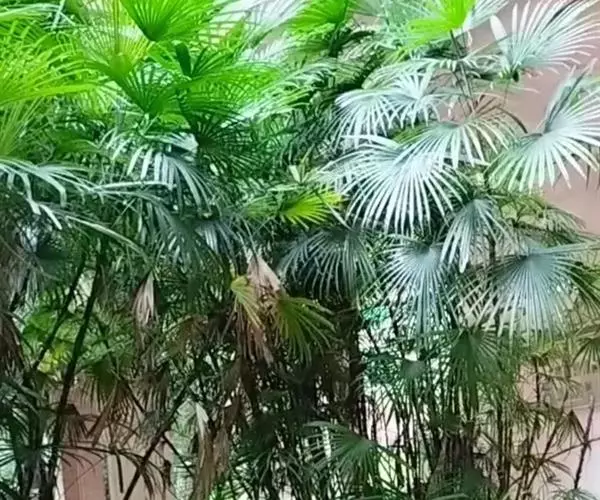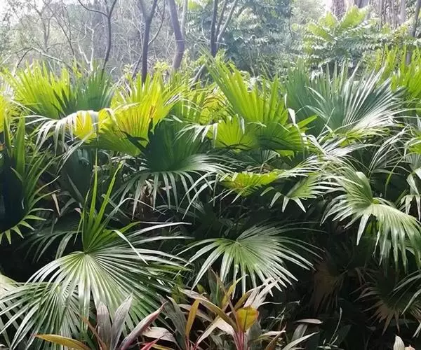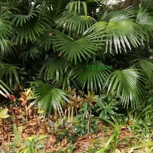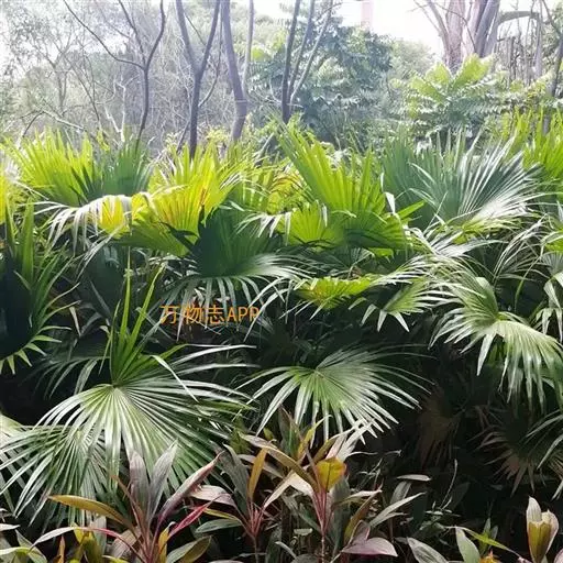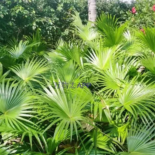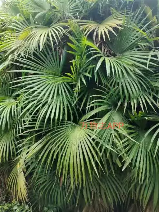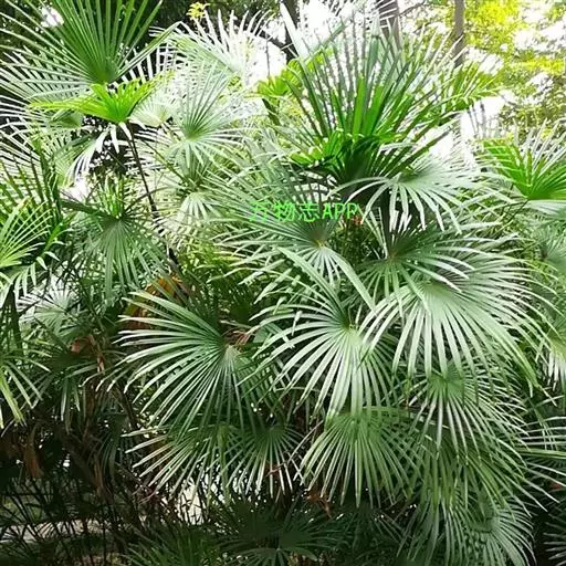 常绿丛生灌木至小乔木状,高3-8m,茎直立、粗壮。叶团扇形,宽50-80厘米,掌状深裂,裂片14-16,线形,先端渐尖,不分裂,或者为2浅裂;叶柄上面具沟槽,无剌。肉穗花序腋生,多分枝,呈圆锥花序式,主轴和分枝上有的管状总苞和漏斗状的小苞片;花两性,子房由2枚合生心皮组成,长圆形,花柱短,柱头2枚。浆果球形,直径约1.5厘米,成熟时呈黄色至红色,外果皮薄革质,中果皮内质;种子球形,径约1厘米,灰白色,具有观赏价值。