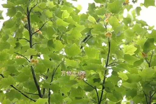 落叶乔木,高达60米,主干通直,叶形似马褂,长7-12厘米,先端略凹,具4裂片,两中裂片长小于宽,近似北美鹅掌楸,叶背面白粉点小,近似中国鹅掌楸。小枝紫褐色,树皮褐色,树皮浅纵裂。花期5-6月,花较大,黄色,具清香,单生枝顶,萼片3,花瓣6,形似郁金香。聚合果纺锤形,先端钝或尖,由多个顶端具1.5-3厘米长翅的小坚果组成,10月成熟,自花托脱落。 [1-2] 杂种鹅掌楸