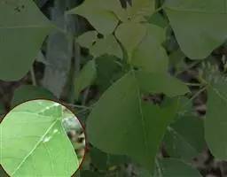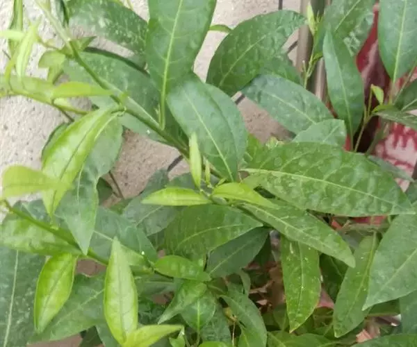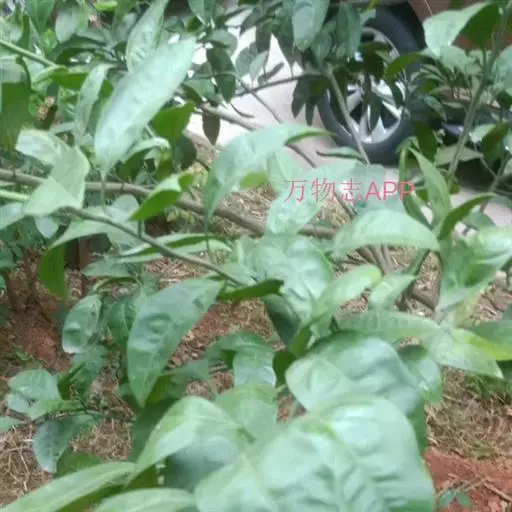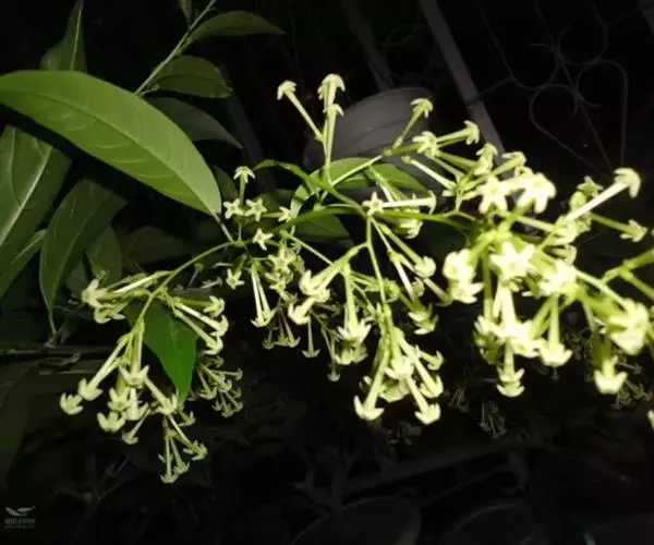 形或矩圆状披针形,长6-15厘米,宽2-4.5厘米,全缘,顶端渐尖,基部近圆形或宽楔形,两面秃净而发亮,有6-7对侧脉。伞房式聚伞花序,腋生或顶生,疏散,长7-10厘米,有极多花;花绿白色至黄绿色,晚间极香。花萼钟状,长约3毫米,5浅裂,裂片长约为筒部的1/4;