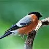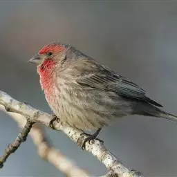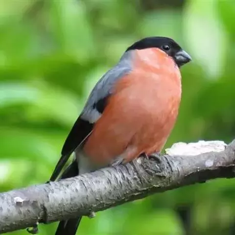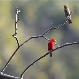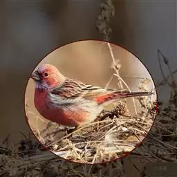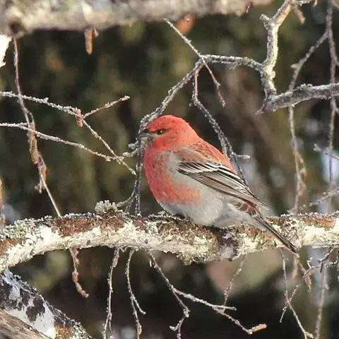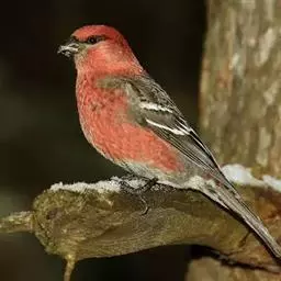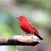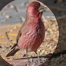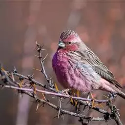 红腰朱雀:体长12-14厘米,小型鸟类。雄鸟前额和眉纹玫瑰粉红色,头顶和一宽的贯眼带深红褐色,背红…