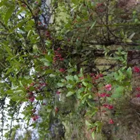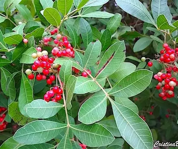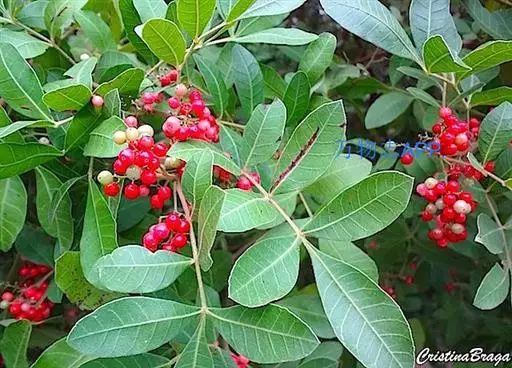 巴西胡椒木,南美巴西。台湾於 1909 年引进栽植。中乔木,树形优美。老茎有垂直的深裂痕,树皮灰白,新枝带点暗红色,分枝多。花期 4~5 月。核果,球形。常被种植为庭园树和行道树。