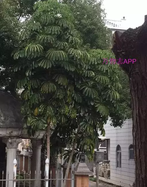 常绿乔木,高可达30~40米。茎杆直立,干光滑,少分枝,初生嫩枝绿色,后呈褐色,平滑,逐渐木质化。叶为掌状复叶,革质,长20~30厘米,宽10厘米,叶面浓绿色。有光泽,叶背淡绿色。叶柄红褐色,长5~10厘米。长椭圆形,先端钝。小叶数随树木的年龄而异,幼年时3~5片,长大时9~12片,至乔木状时可多达16片。花为圆锥状花序,花小型。浆果,圆球形,熟时紫红色。