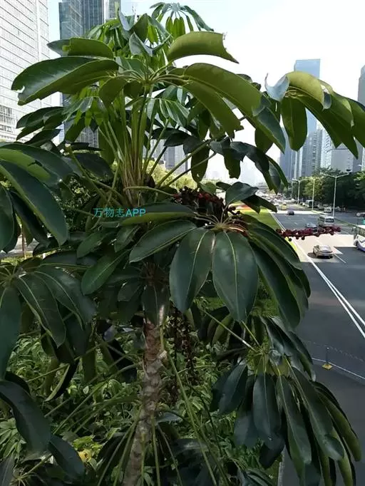 昆士兰伞木,吕松鹅掌柴 ,称昆石兰遮树,澳洲鸭脚木、方式叶鹅掌柴、伞树、大叶伞。叶片阔大,柔软下垂,形似伞状,株形优雅轻盈,易于管理,适于客厅的墙隅与沙发旁边置放,是室内理想的观叶植物。但目前多由南方引进,成本较高。常绿乔木,高可达30~40米。茎杆直立,少分枝,嫩枝绿色,后呈褐色,平滑。叶为掌状复叶,小叶数随树木的年龄而异,幼年时3~5片,长大时5~7片,至乔木状时可多达16片。小叶片椭圆形,先端钝,有短突尖,叶缘波状,革质,长20~30厘米,宽10厘米,浓绿色叶子。有光泽,叶背淡绿色。叶柄红褐色,长5~10厘米。浆果,圆球形,熟时紫红色。