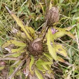 头状花序近无梗或于果期有长达8毫米的短梗,单生于侧枝之顶,直径7-10毫米;总苞钟形或近圆筒形,直径6-8毫米;总苞片5枚,内层与外层的形状相似,大小几相等,长圆形或近长圆形,长8-10毫米,宽2.5-3毫米,顶端钝,背面被紧贴的绢毛;花托小,不平,无毛,直径约1.2毫米。花雌性和两性异株,先叶开放;雌花花冠紫红色,长约13毫米,舌状,舌片长约6毫米,顶端3浅裂,两性花花冠白色,管状2唇形,长约13毫米,5裂,裂片极不等长,长的达8毫米,短的长仅1.5毫米;花药长达6毫米,顶端尖,基部箭形,尾部渐狭,长约1.5毫米;雌花花柱分枝外卷,顶端略尖,两性花的子房退化。瘦果纺锤形,长约7毫米,密被毛。雌花冠毛丰富,多层,浅白色,长约10毫米,两性花的冠毛少数,2-4条,雪白色,长7-8毫米。花期5月。