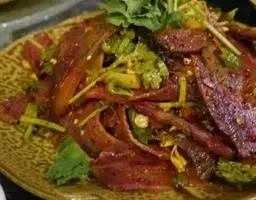 麻辣牛肉是一道四川省的传统名菜,属于川菜系,制作原料主要有牛肉、豆腐、豌豆等,此菜色泽褐红,麻辣鲜香,…