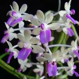 风兰 H.H.Hu):植株高8-10厘米。茎长1-4厘米,稍扁,被叶鞘所包。叶厚革质,狭长圆状镰刀形。…