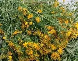 贯叶连翘(学名:Hypericum perforatum L.)是藤黄科,金丝桃属多年生草本植物,高可达厘米,全体无毛。茎直立,多分枝,叶无柄,叶片椭圆形至线形,先端钝形,边缘全缘,背卷,上面绿色,下面白绿色,脉网稀疏,不明显。聚伞花序,生于茎及分枝顶端,苞片及小苞片线形,萼片长圆形或披针形,花瓣黄色,长圆形或长圆状椭圆形,两侧不相等,雄蕊多数,花药黄色,子房卵珠形,蒴果长圆状卵珠形,种子黑褐色,圆柱形,7-8月开花,9-10月结果。