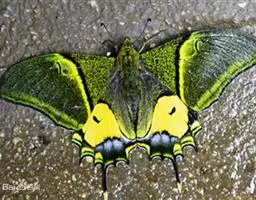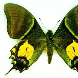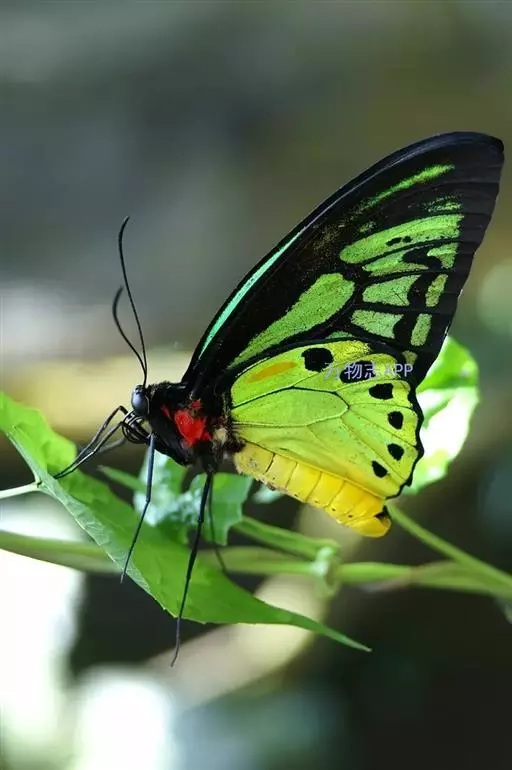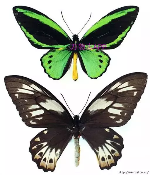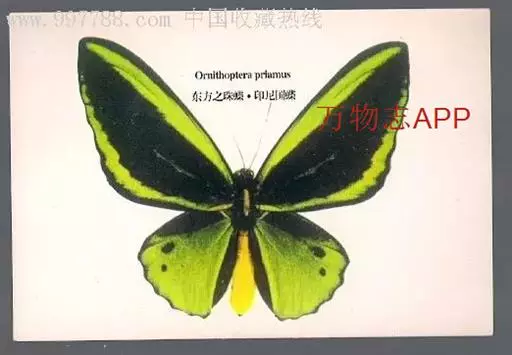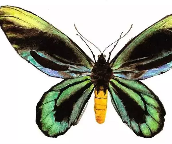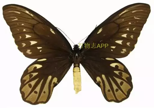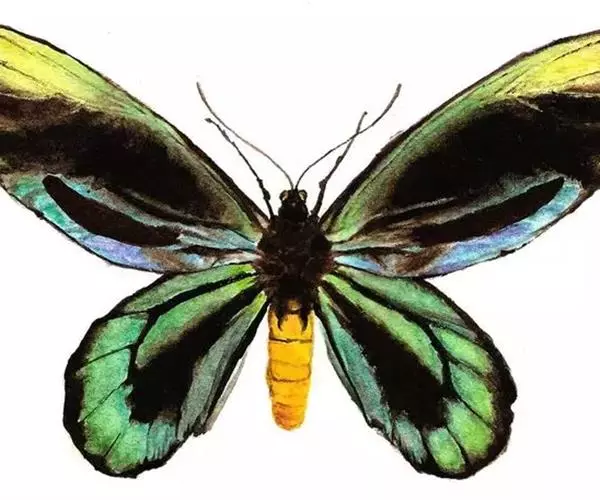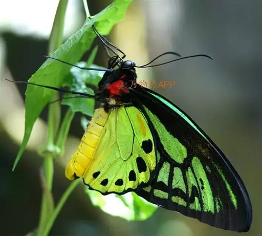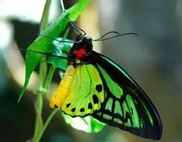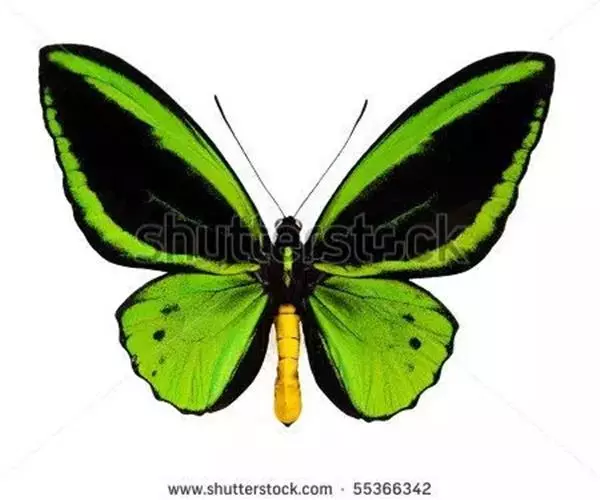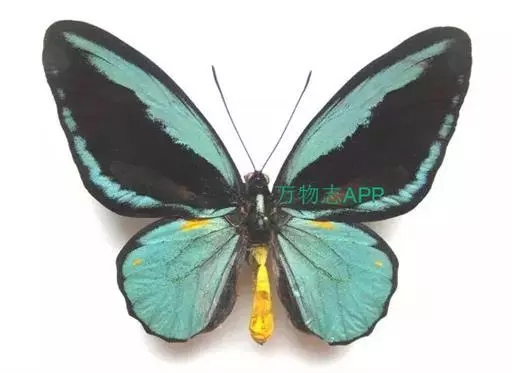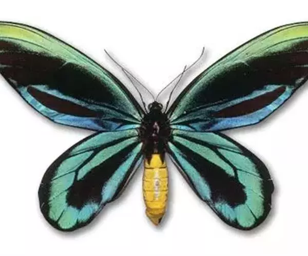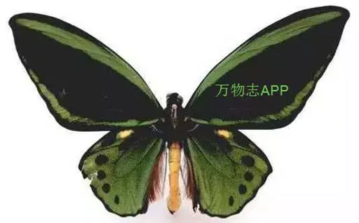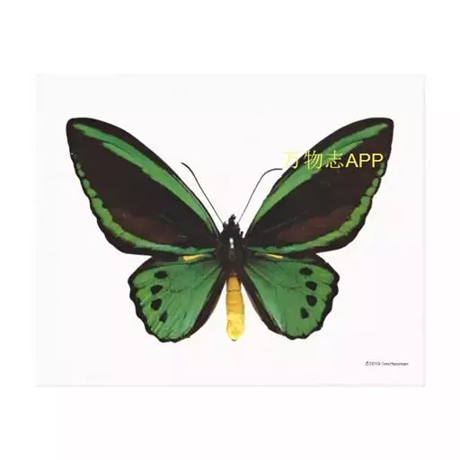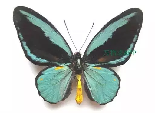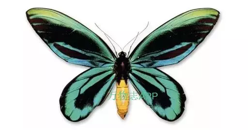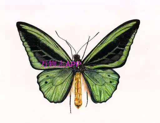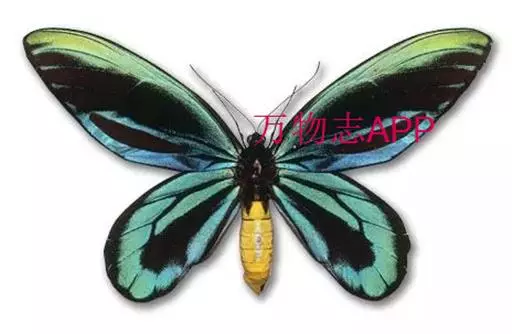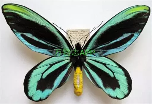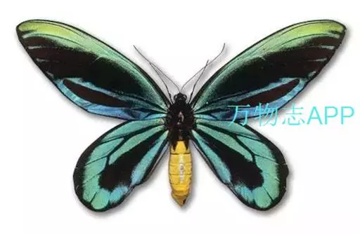 亚历山大鸟翼凤蝶(Ornithoptera alexandrae)雌蝶的翅展达280毫米,是世界上已知的最大的蝴蝶。雄蝶比雌 蝶小很多,但翅膀的花纹和颜色异常诱人。雄蝶后翅反面金黄色,布有黑脉纹,并具绿色色泽。喜在树顶飞翔。此 蝶不能用一般的捕虫网采集,当地土著人用弓箭射伤而捕获之。