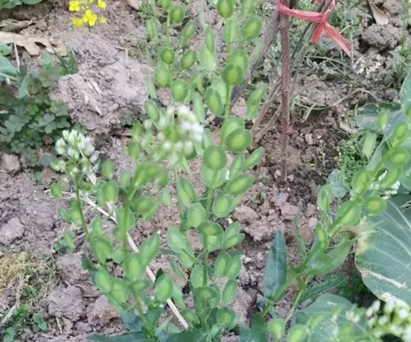 短角果倒卵形或近圆形,长13-16毫米,宽9-13毫米,扁平,顶端凹入,边缘有翅宽约3毫米。种子每室2-8个,倒卵形,长约1.5毫米,稍扁平,黄褐色,有同心环状条纹。花期3-4月,果期5-6月。