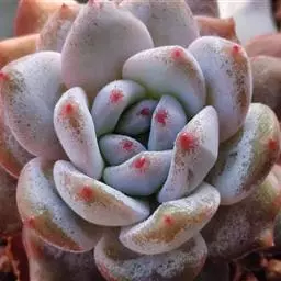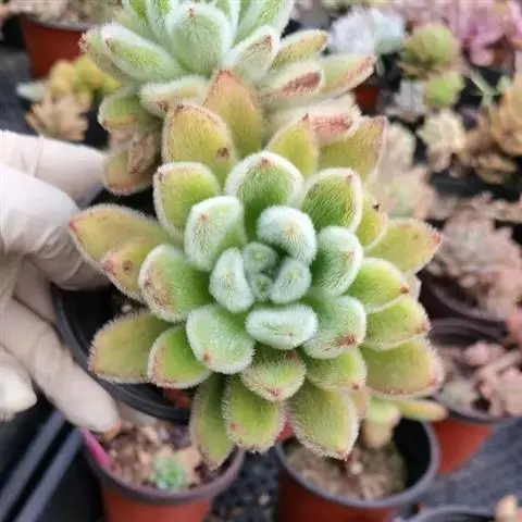 姬莲(Echeveria minima),原产于墨西哥伊达尔戈州等地。姬莲拉丁名的种加词意为“最小的”,中文名称中的“姬”也指的是其娇小的株形。是景天科,拟石莲花属的一种多肉植物。小型种,栽培难度较大。目前国内市场价格很昂贵,是一种观赏价值非常高的景天科多肉植物。 小红衣的小叶片呈莲座状紧密排列,叶片呈微扁的卵形,叶尖两侧有突出的薄翼。强光下,叶缘和叶尖会呈现出漂亮的红色。