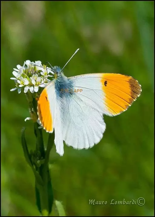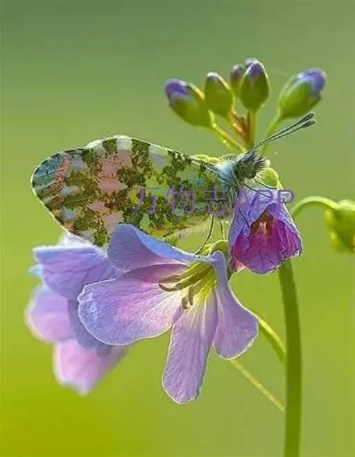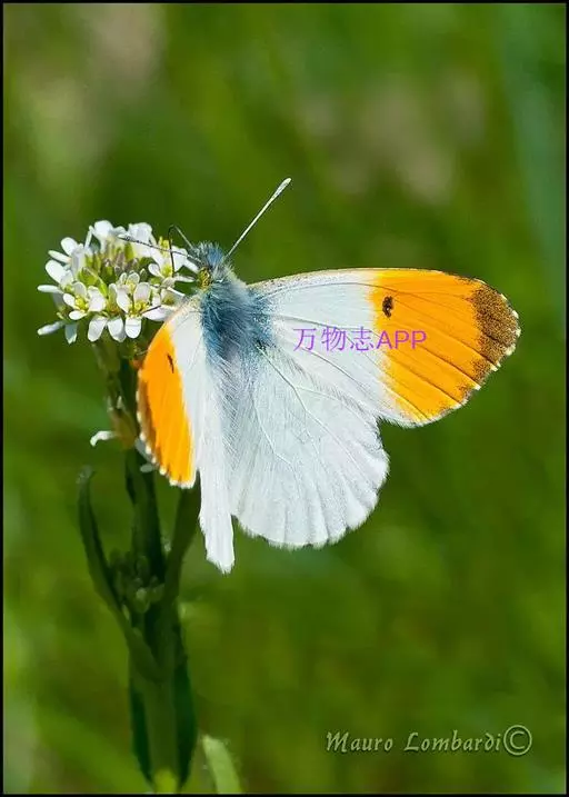翅白色。前翅顶角及脉端黑色,中室端有1个肾状黑斑,雄蝶翅端部(中室端斑以外)橙红色,雌蝶全部白色;后翅反面有淡绿色云状斑,从正面可以透视。