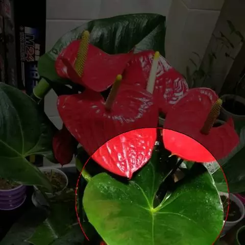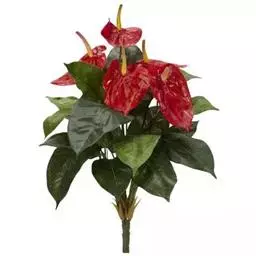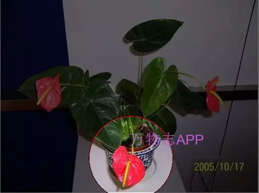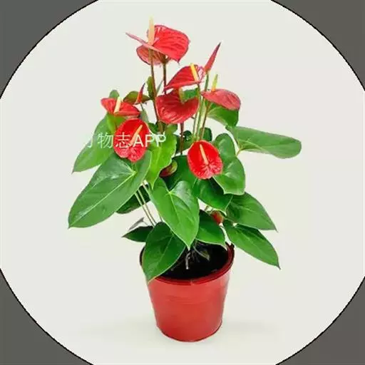 其株高一般为50~80cm,因品种而异。具肉质根,无茎,叶从根茎抽出,具长柄,单生、心形,鲜绿色,叶脉凹陷。花腋生,佛焰苞蜡质,正圆形至卵圆形,鲜红色、橙红肉色、白色,肉穗花序,圆柱状,直立。四季开花。
