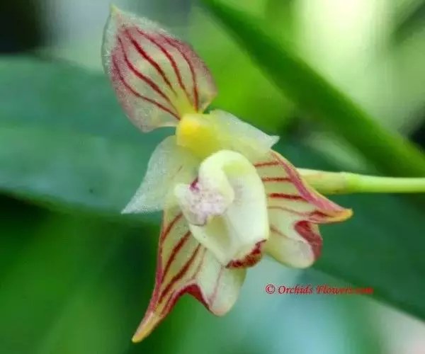花葶出自假鳞茎基部,1-3个,圆柱形,直立,连同花梗和子房长4-7厘米,顶生1朵花;花序柄长6-8毫米,粗约1毫米,基部具2-4枚紧抱于花序柄的干膜质鞘;花梗和子房长1-1.4厘米;花苞片膜质,卵形,长约3毫米;花多少点垂,淡黄色带紫色;中萼片近长圆形,长约1厘米,中部宽5毫米,先端急尖或锐尖,具5条脉,无毛,边缘全缘;侧萼片斜卵状三角形,与中萼片近等长,中部宽6毫米,中部以上偏侧而扭曲呈喙状,先端稍钝,基部贴生于蕊柱足而形成宽钝的萼囊,具5条脉。