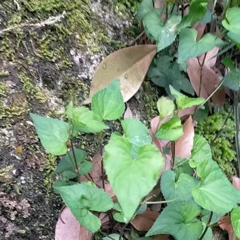 多皱缩成团具细长的根。湿润展开后,基生叶较小,茎生叶较大,三角状心形,叶柄基部有披针形托叶。花由茎生叶的叶腋抽出,淡棕紫色。气微,味微苦。