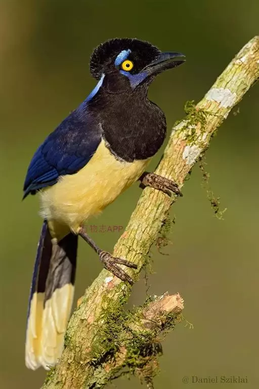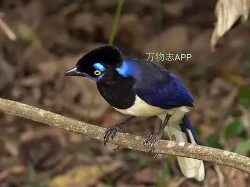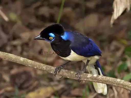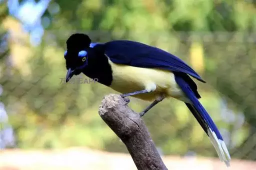 绒冠蓝鸦(学名:Cyanocorax chrysops):雌雄相似,体长35厘米,体重127-170克。具中等长度的鸟喙。平均体重约为157克,外形漂亮,脸部黑色,眼圈金色,眼圈四周有蓝色斑块,头上羽冠黑色如同黑色毡帽戴在头顶,非常醒目,喉部蓝色,下体胸部黑色,腹部黄色,背部蓝黑色,上部和翅上覆羽为暗紫色。尾巴相同,但尾羽终端具有很宽的白色或微黄色羽毛。鸟喙和腿黑色。虹膜柠檬黄或淡黄色。