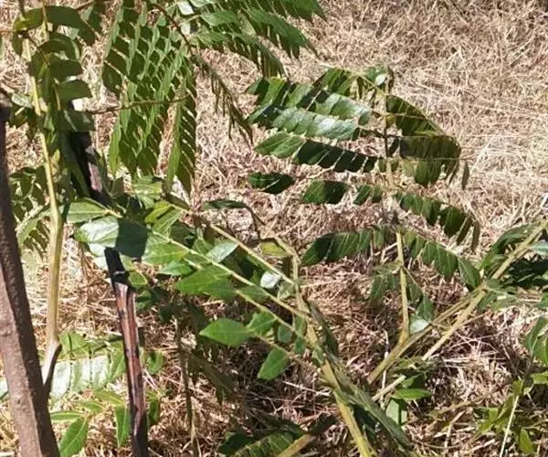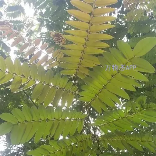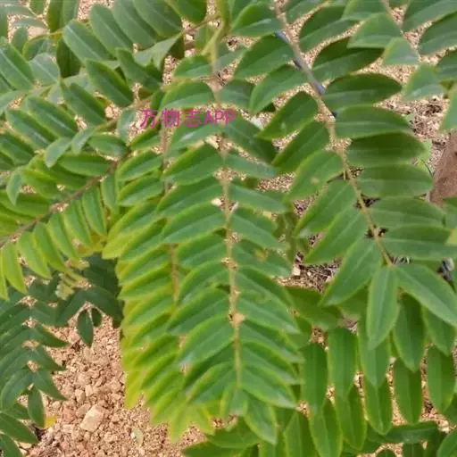叶长25-45cm;叶柄短,长约3-5cm;叶轴及叶柄多少被黄色微柔毛;小叶薄革质,长圆状披针形,长6-9cm,阔2-3cm,基部圆形,顶端短渐尖或急尖,边全缘,上面无毛,下面有灰白色的糙伏毛;小叶柄长2-3mm。